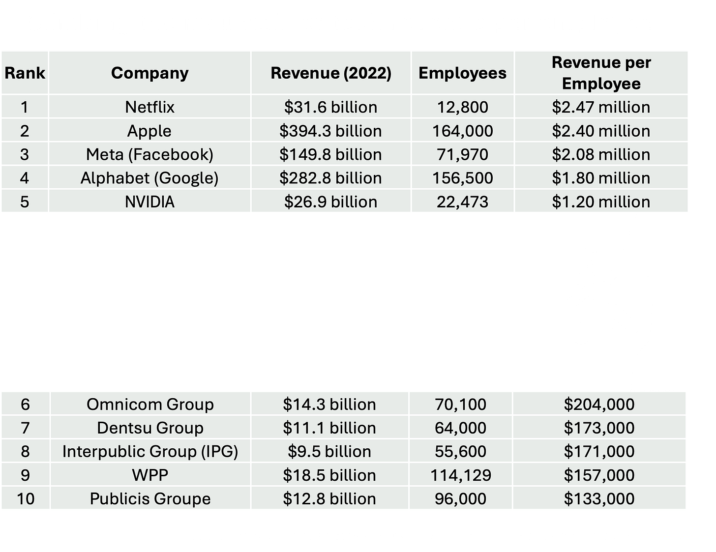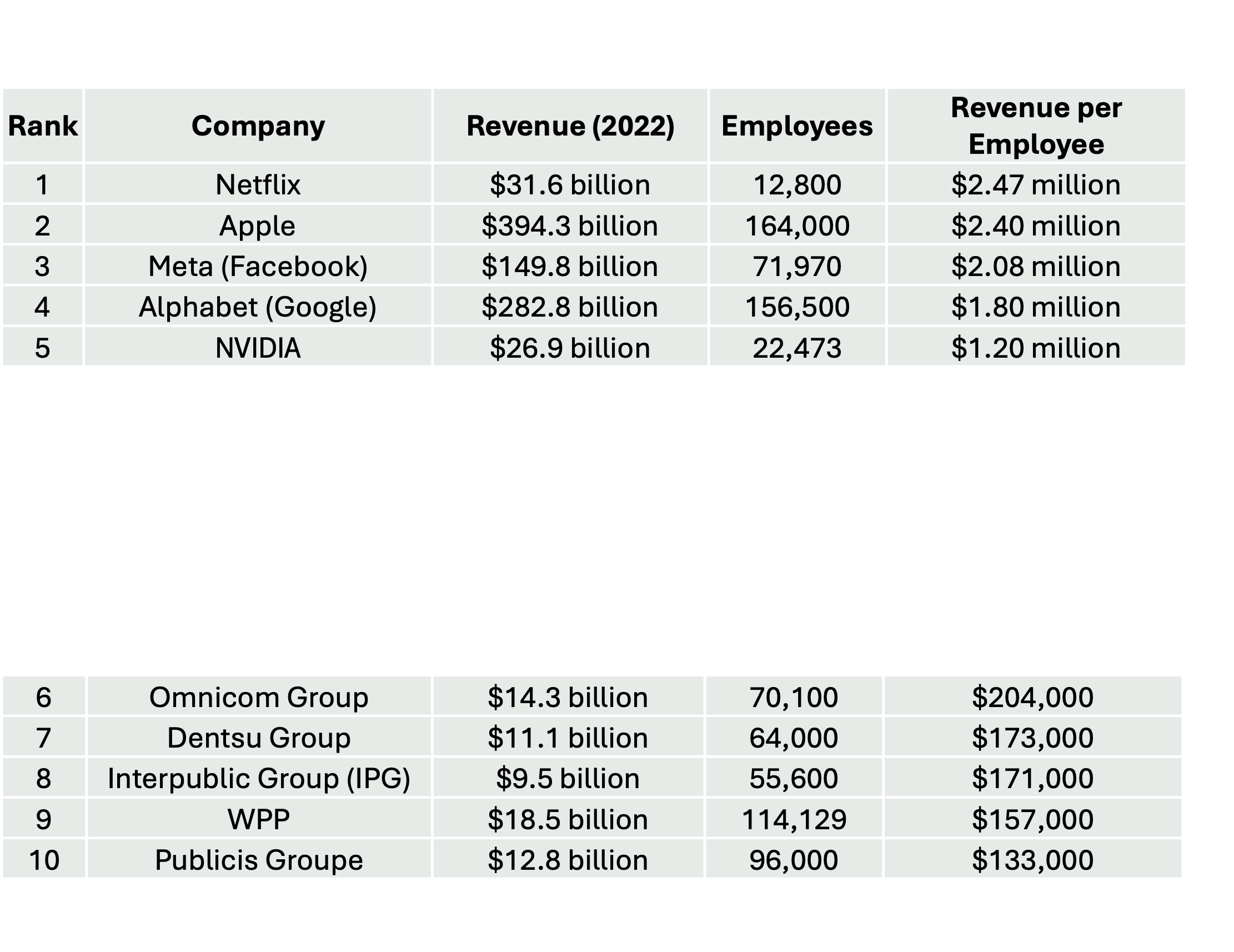 Here’s a comparison of revenue per employee between some of the world’s leading tech companies and marketing holding companies: