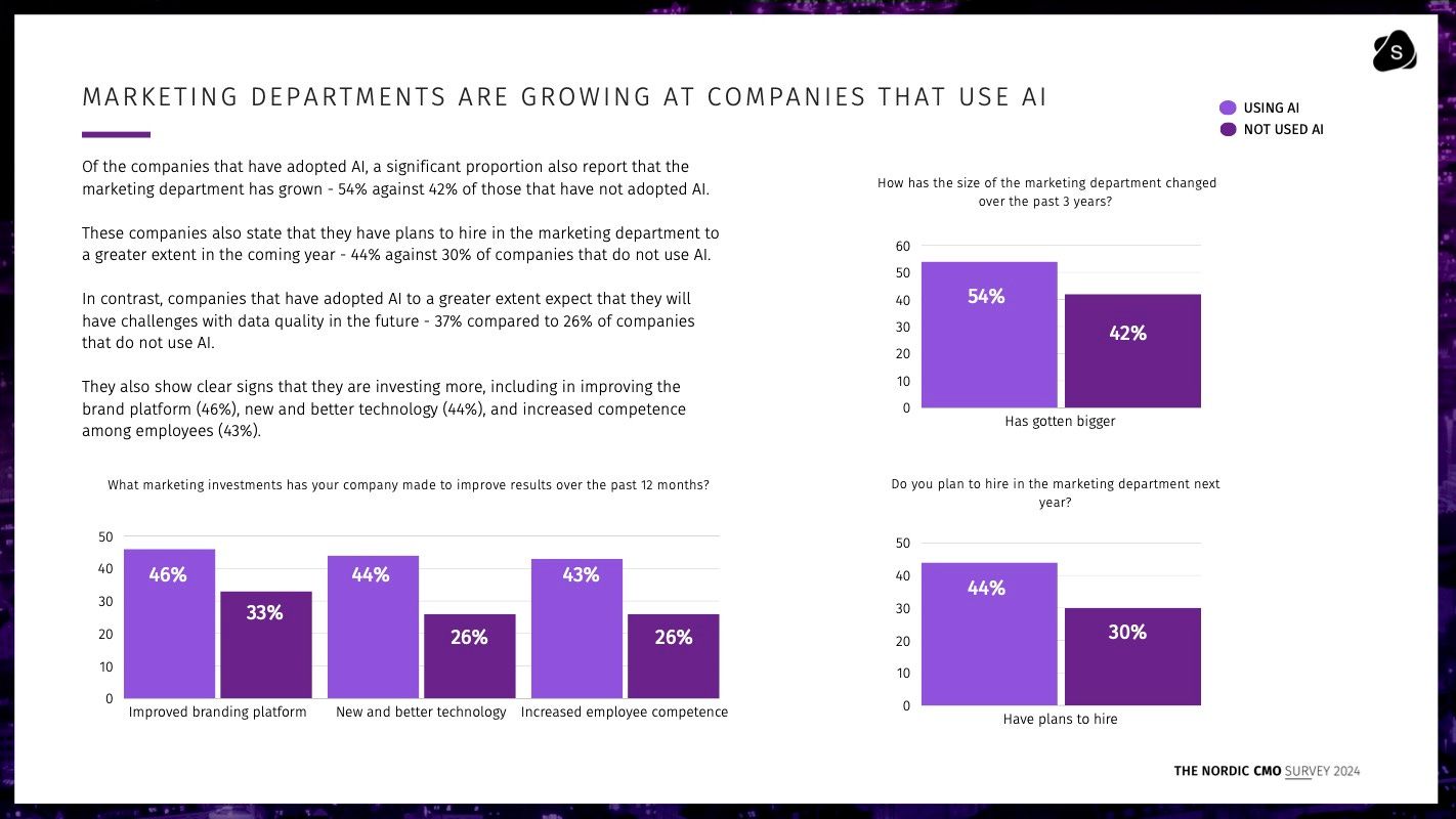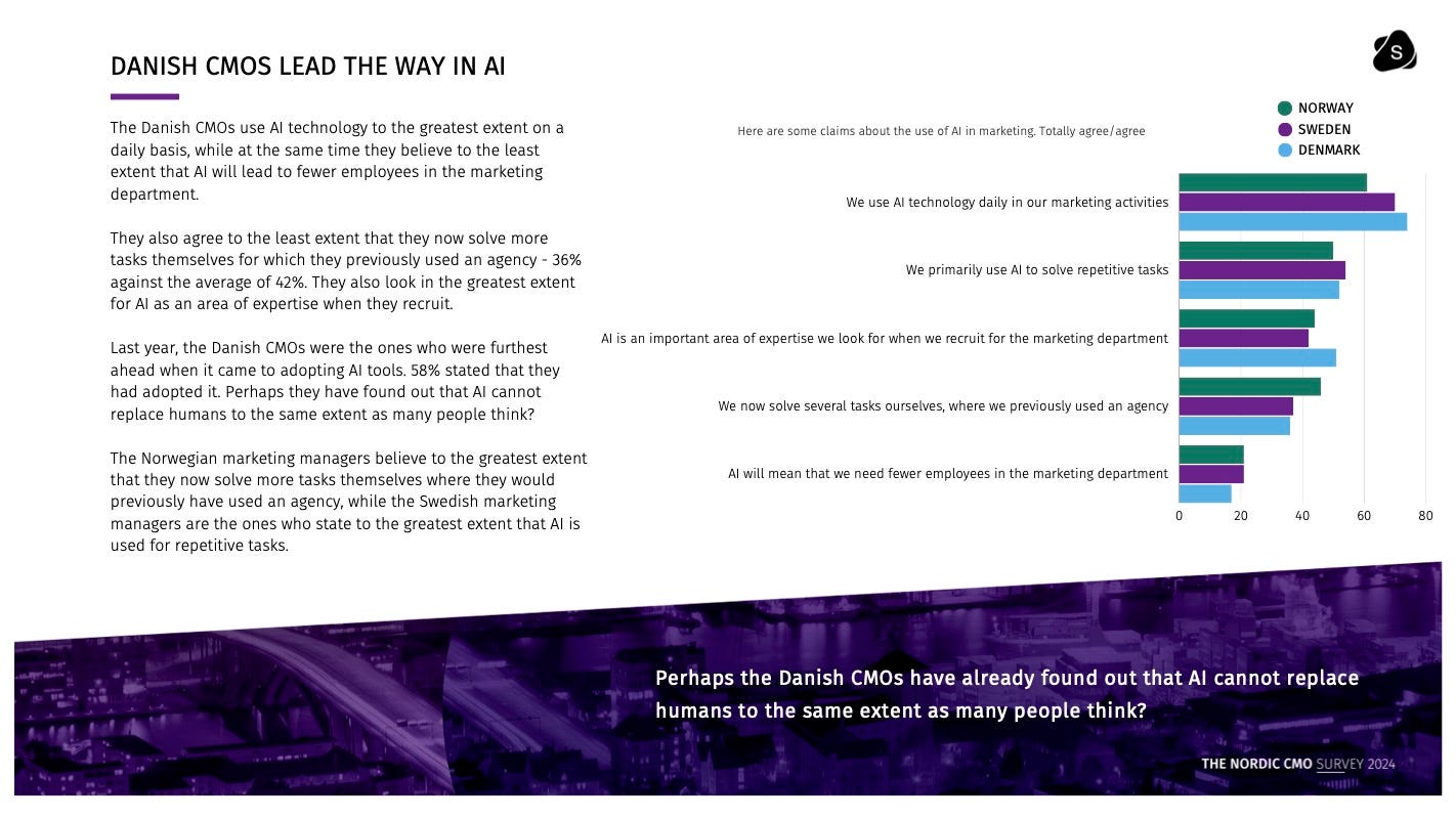 Companies excelling in marketing within the region are those investing heavily in AI, with a clear divide between firms that adopt AI technologies and those that do not. Successful companies, particularly in Denmark, have not only increased their investment in technology but also in branding and employee competency.