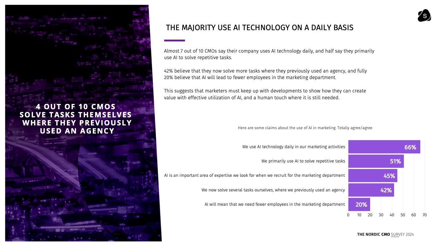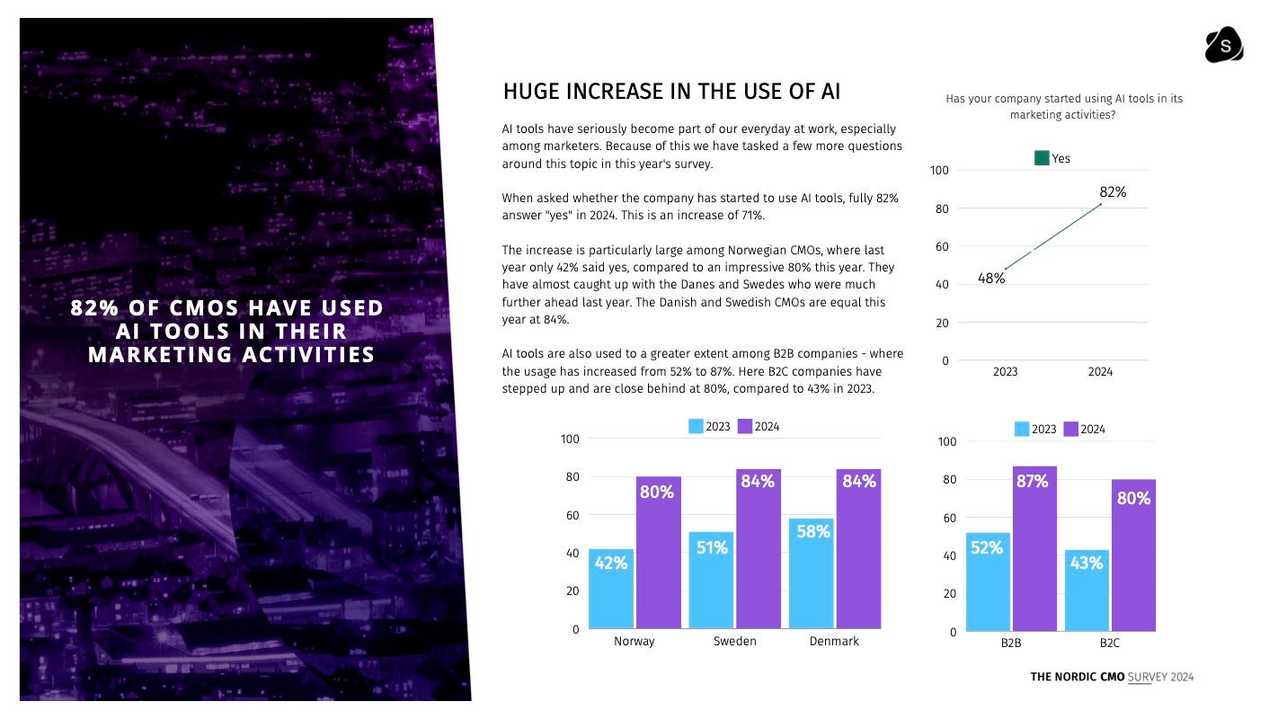 Danish CMOs report a robust integration of AI in their strategies, with an 84% adoption rate, aligning closely with broader Nordic trends where AI usage has surged from 48% in 2023 to 82% in 2024. Denmark, however, distinguishes itself by leveraging AI beyond operational tasks, focusing on enhancing creativity and customer engagement.