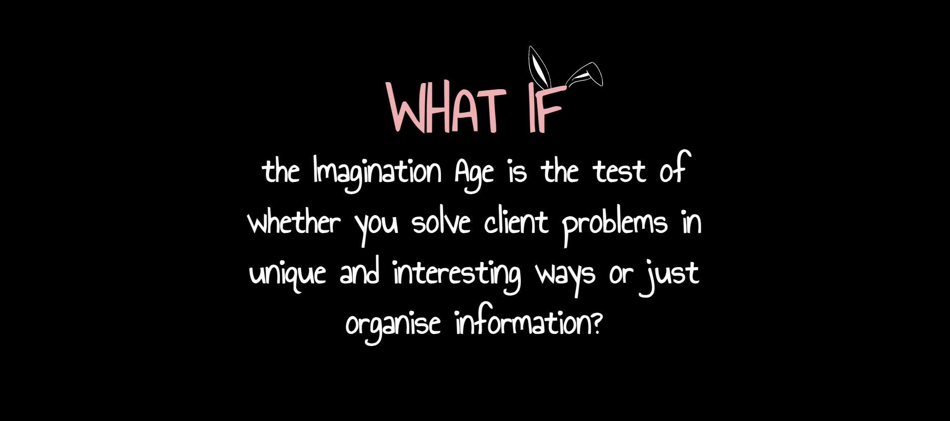 In the dawning Imagination Age, the true measure of success pivots dramatically. It's no longer about how efficiently we can organise and access information. Instead, the spotlight turns to how uniquely and creatively we solve problems for our clients. This scenario explores a world where imaginative solutions are the gold standard, distinguishing those who merely manage data from those who use it as a springboard for innovation and unique value creation.